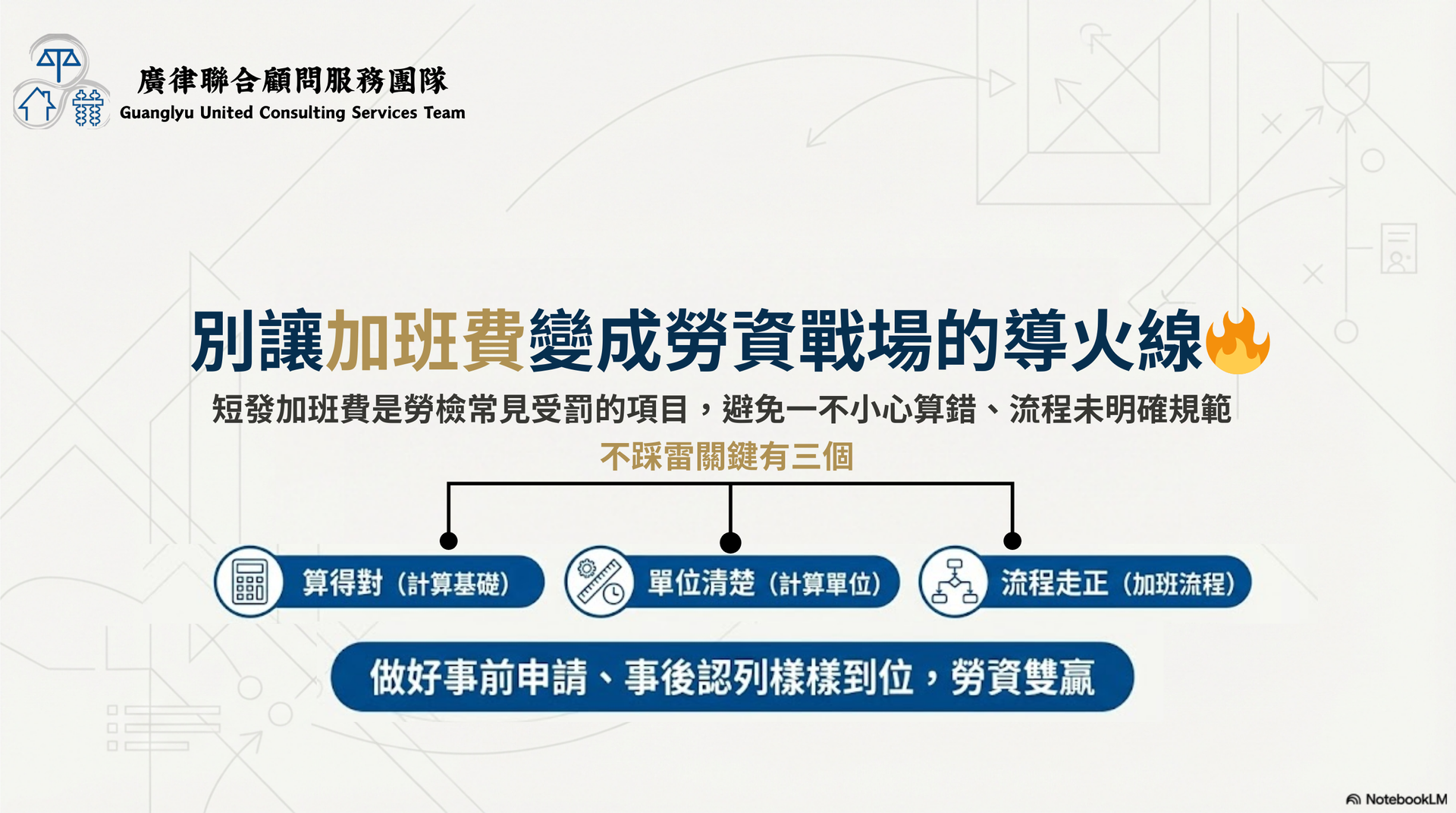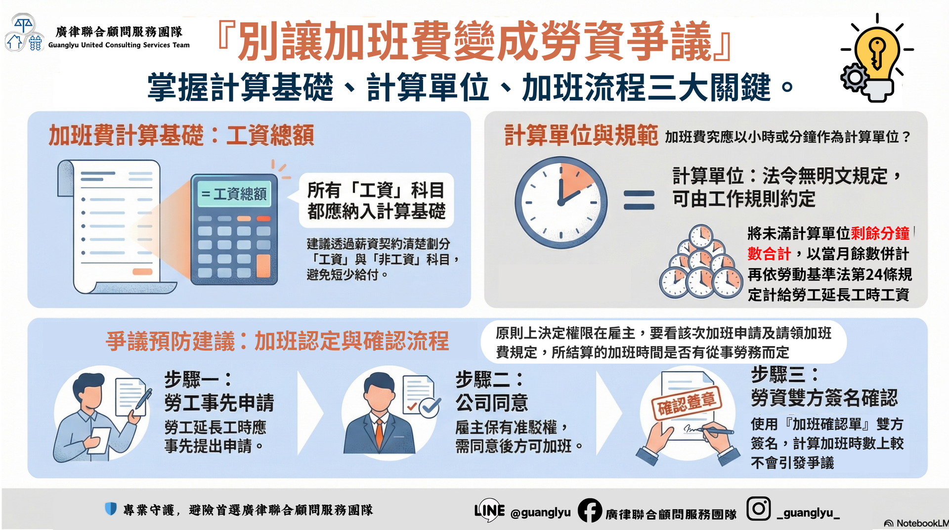 #廣律聯合顧問服務團隊 #勞資關係 #加班費 #勞檢防範 #計算基礎 #加班流程 #勞資糾紛預防