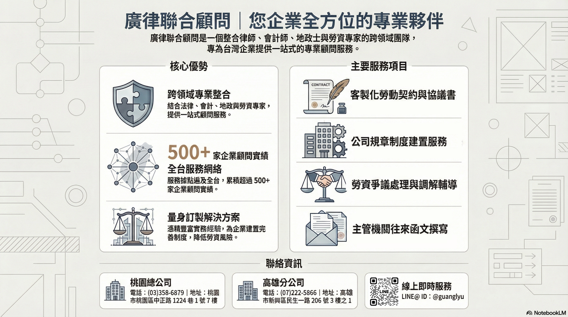 如有任何勞資法規疑問,歡迎洽詢廣律聯合顧問服務團隊。