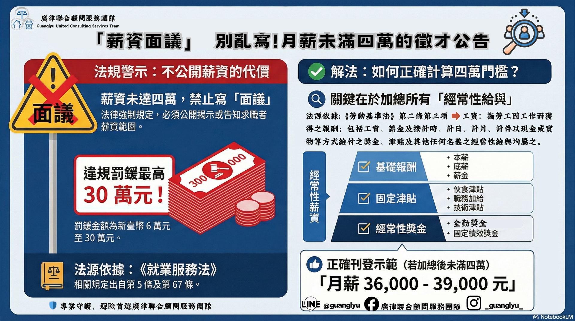 4 萬紅線:經常性薪資未滿 4 萬元,禁止寫面議。